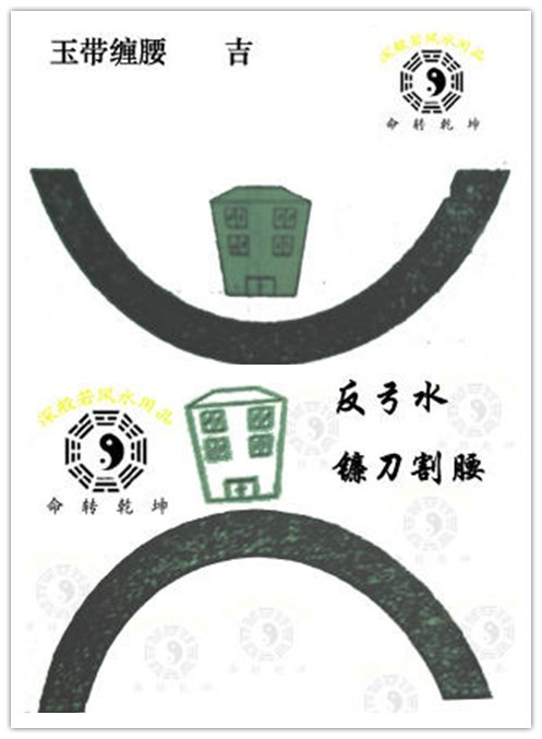 外部環境包括水流與道路。其中反弓煞(指住宅前有反弓形的道路、河流,弓對著住宅,弦對著外面)危害巨大,大到一個城市,小到家庭。例如:浙江黃岩,價錢便宜,交通便利,但不幸是反弓水地形。「2011年那塊地被綠地董事長宋衛平66.6億買到,5個月後就傳出宋衛平資金鏈斷裂的消息。」