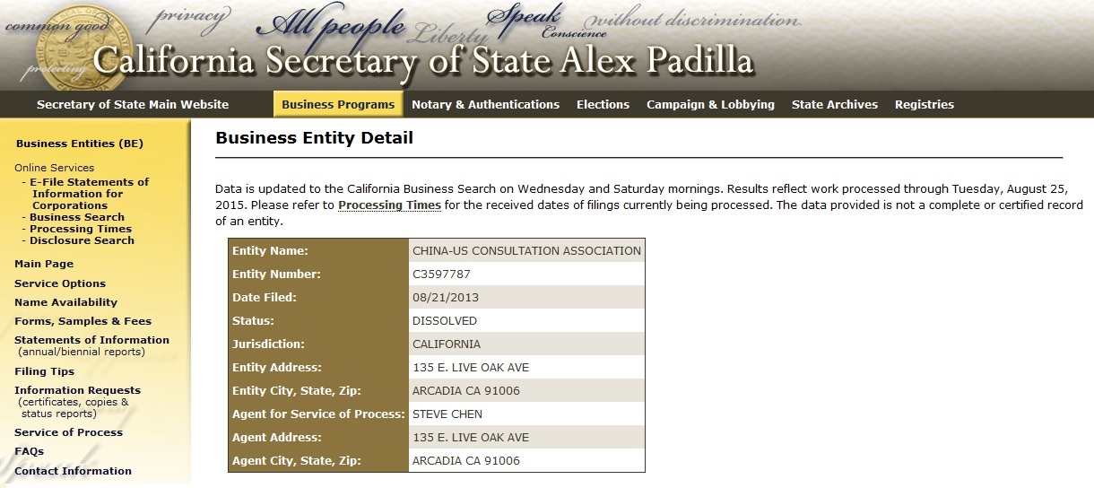 根據加州州務卿網站,「中美政治協商促進會」(China-US Consultation Association)已經解散(dissolved)。(網頁截圖)