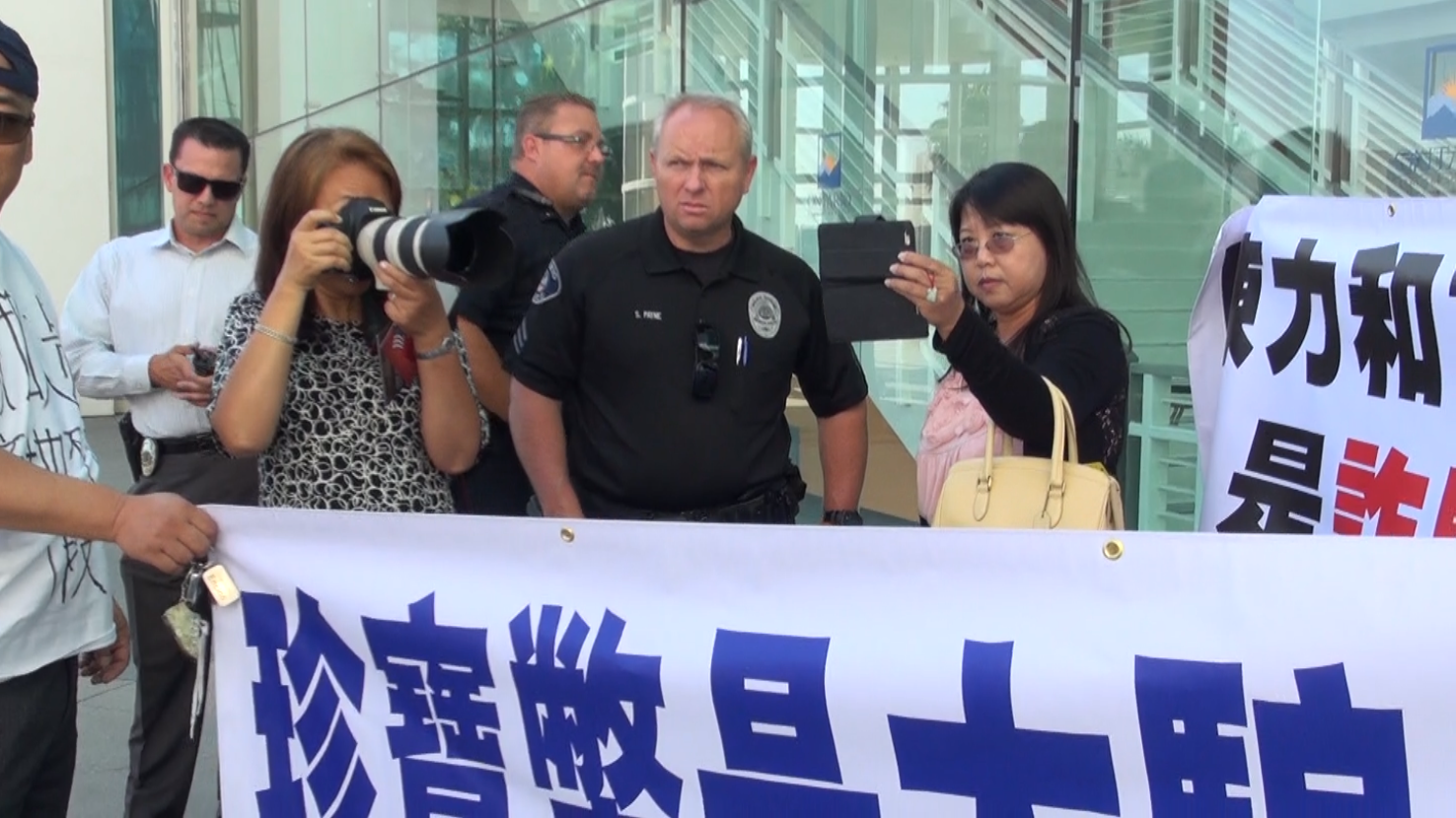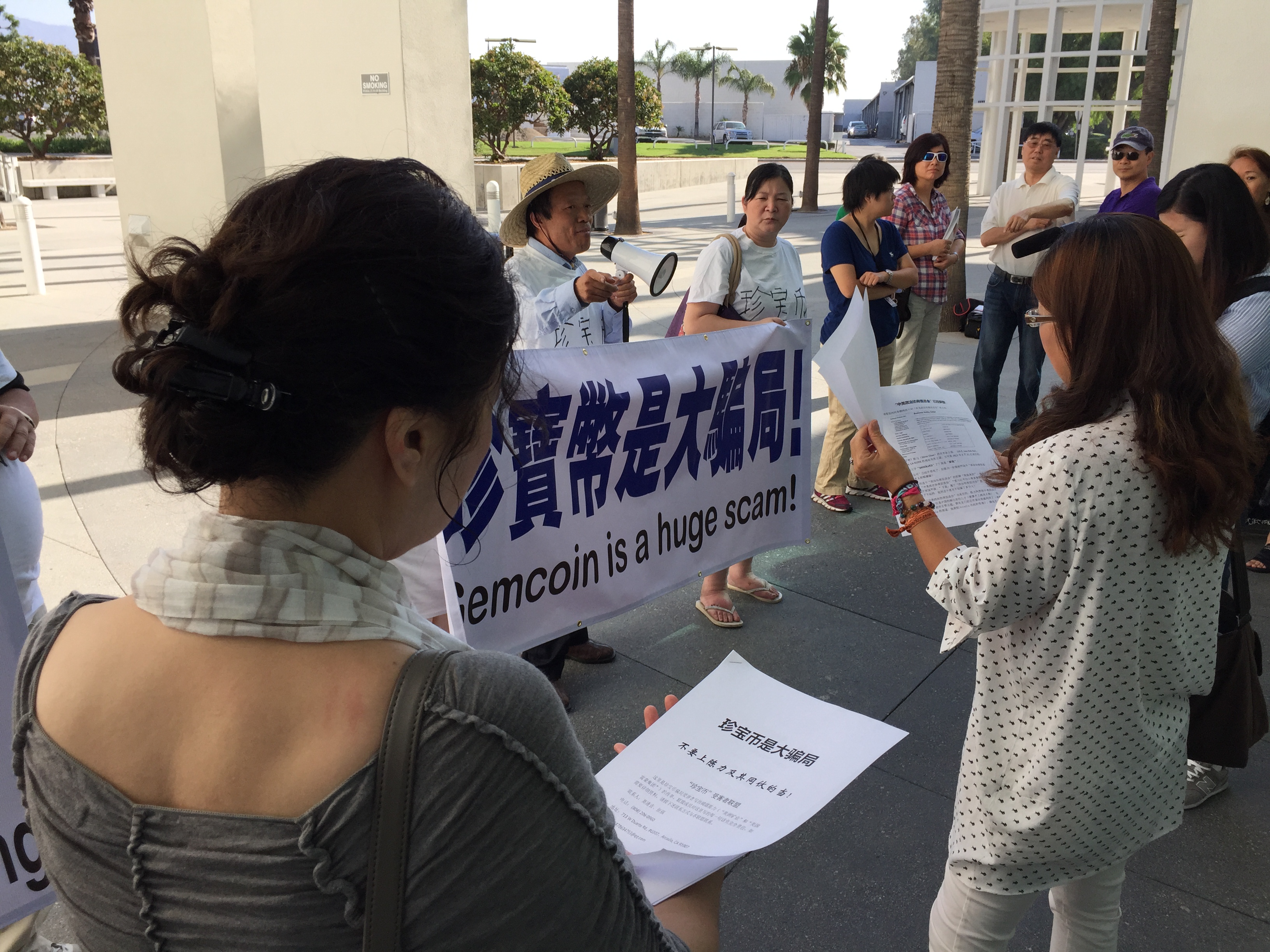 一群華裔投資人在聖貝納迪諾縣安大略會議中心 (Ontario Convention Center) 外抗議「美國富豪集團」,稱其發行的珍寶幣為一個大騙局,並向與會者散發資料。(大紀元)