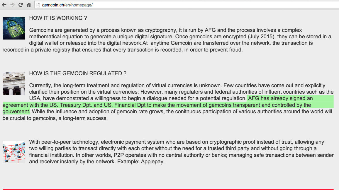 「美國投資聯盟集團」來頭更大,根據該公司在美國中文媒體發布的新聞稿,它「是一家大型跨國企業AFG集團,投資的項目涉足金融、房地產基金(REIT)、房地產礦業(寶石類)、拍賣、通訊、生物技術及航空社備器材等,業務遍及北美洲、南美洲、歐洲、亞洲和澳洲。AFG集團全球總資產達500多億美元,在全球有200多萬個用戶,將建立三千家寶石連鎖店,這一切奠定了Gem幣無可匹敵的市場基礎及幣值保持相對穩定。」