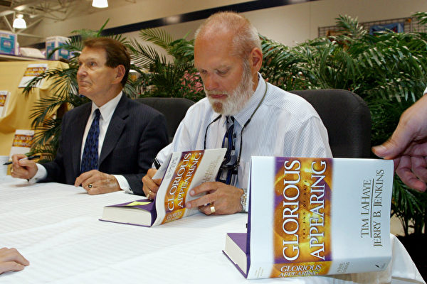 蒂姆·萊希(Tim LaHaye,左)和傑里·詹金斯(Jerry B. Jenkins,右)合著了暢銷系列小說《末日迷蹤》(Left Behind)。圖為2004年二人在路易斯安那一家書店簽名售書。(Mario Villafuerte/Getty Images)