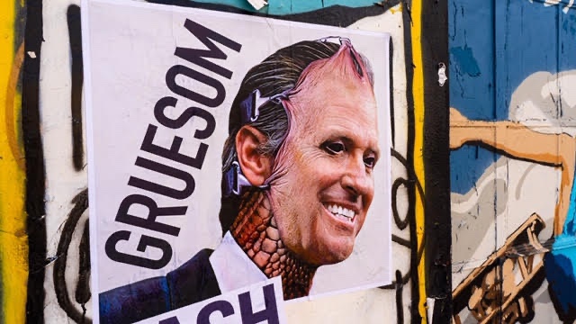 好莱坞大道上杜比剧院附近的另一张海报将纽森描绘成一个名为 “Gruesom “的整容怪物,灵感来自恐怖电影《电锯》(Saw)。