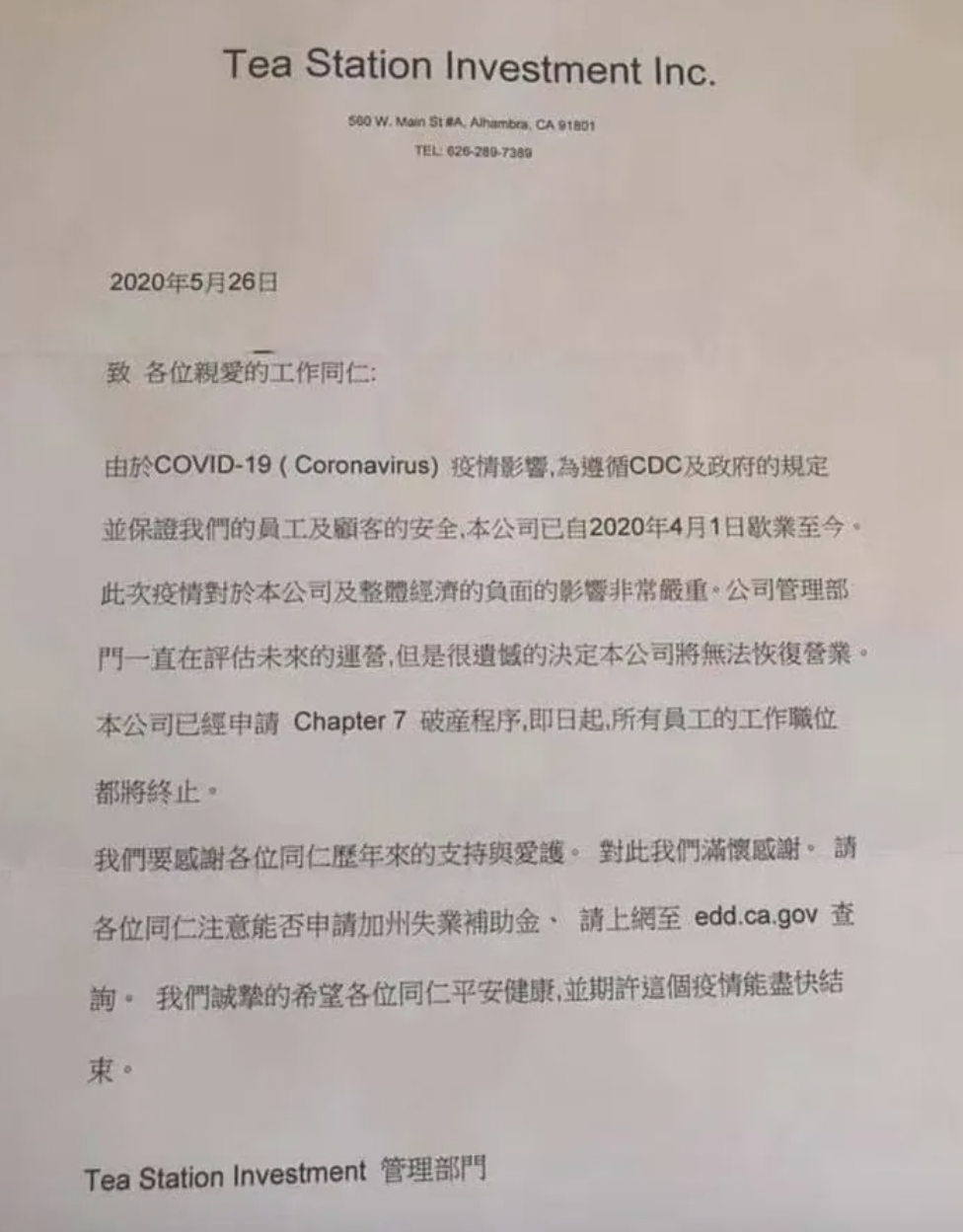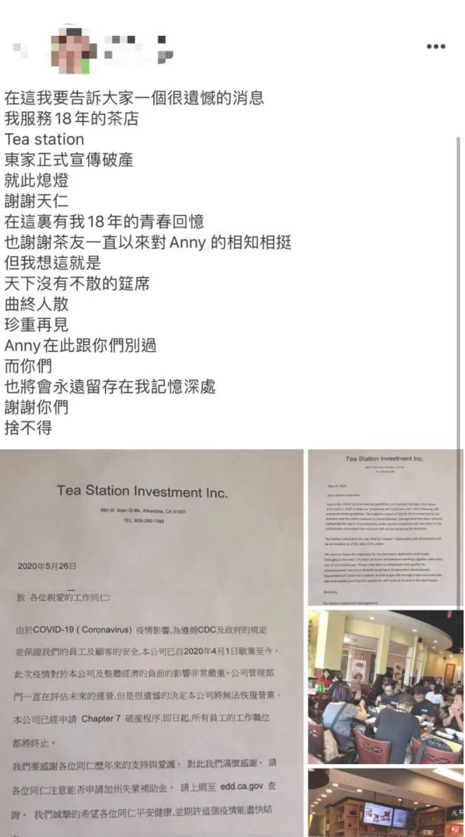 刚刚听说,加州著名的华人企业Tea Station加州茶棧也倒闭了,就把它列到了名单里的第0号。Tea Station将关闭旗下12家店面,作为很多南加州华人刚来美国常喝的奶茶,Tea Station承载了很多华人回忆,陪伴了很多人长大。