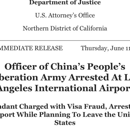 解放军一军官因涉嫌签证欺诈在洛杉矶被捕 Chinese military officer and researcher arrested at LAX is charged with visa fraud