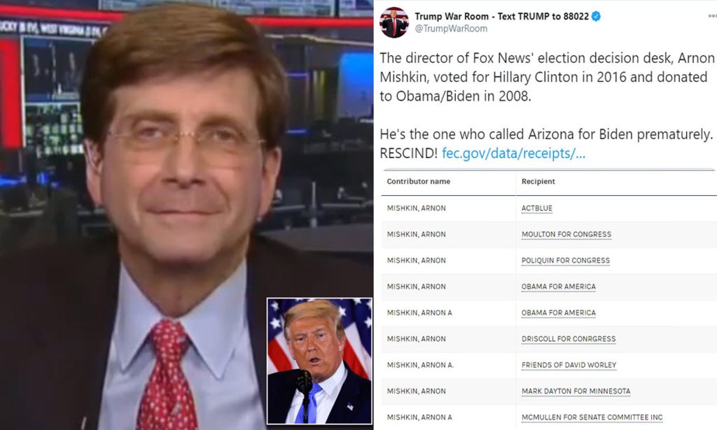 福克斯新闻的选举决策台主任阿农-米什金(Arnon Mishkin)在数十万张选票还没有统计出来之前,就宣布拜登赢得了亚利桑那州,引起川普团队的愤怒。据川普团队揭露:米什金是一名注册的民主党人,他在2016年投了希拉里-克林顿的票,曾担任民主党政治顾问,并有长期向民主党人捐款的记录,包括2008年给奥巴马-拜登的竞选活动。