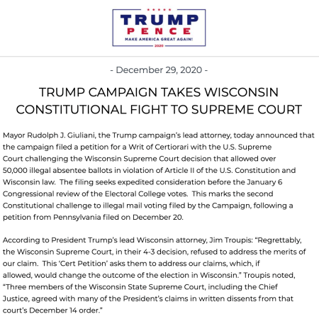 川普法律团队向美国最高法院提交质疑威斯康星州邮寄选票的诉讼