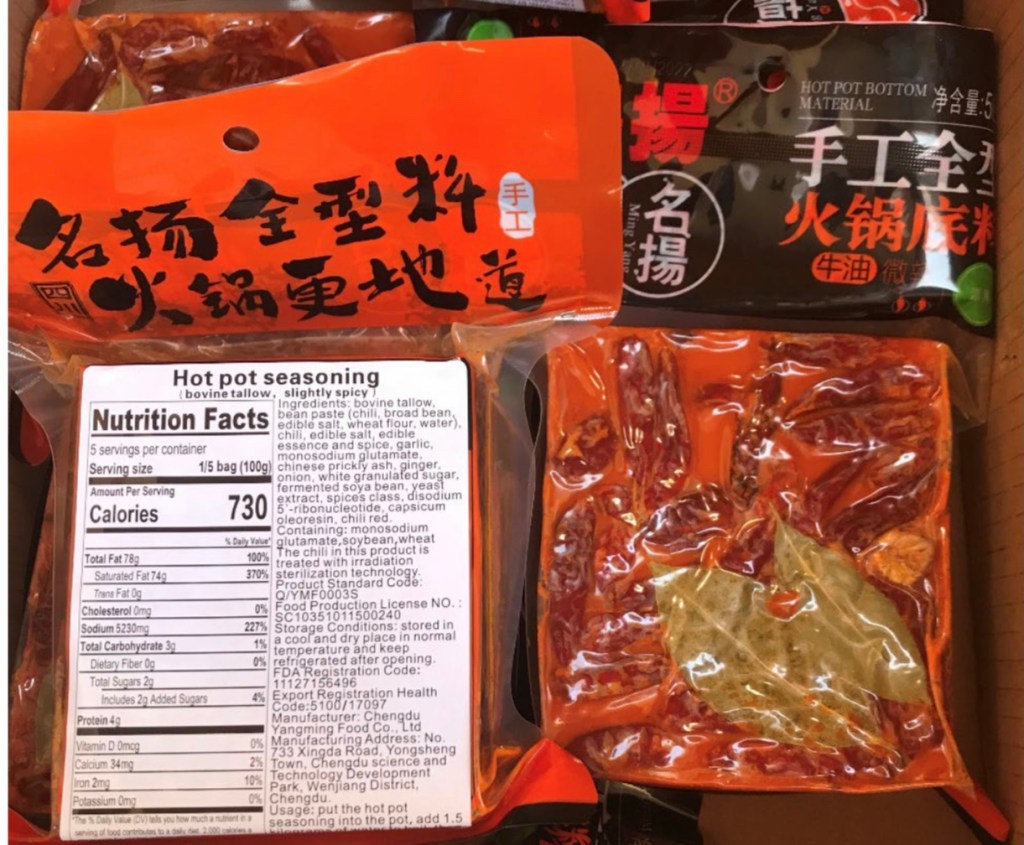 2月23日,美国多家媒体报导,加州GLG贸易公司将召回从中国进口的近10万磅没有经过适当程序的调味品。美国食品安全检查局(FSIS)的官方网站显示,此次被召回的产品是四川产的“名扬”(Ming Yang)火锅底料。