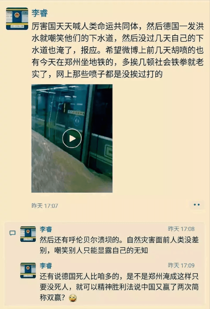 网络曝光的截图显示,李睿在微信朋友圈说,郑州地铁被淹是中国嘲笑德国洪水的报应,并称希望微博上喷德国的也有今天在郑州坐地铁的。他还自曝称「我这几年闷声发大财就收了很多贿赂,总计得十几万(人民币),然后高利贷也收了二十万」。此外,李睿曾在2020年就日本侵华称,「日本要是多占领几年就好了」。