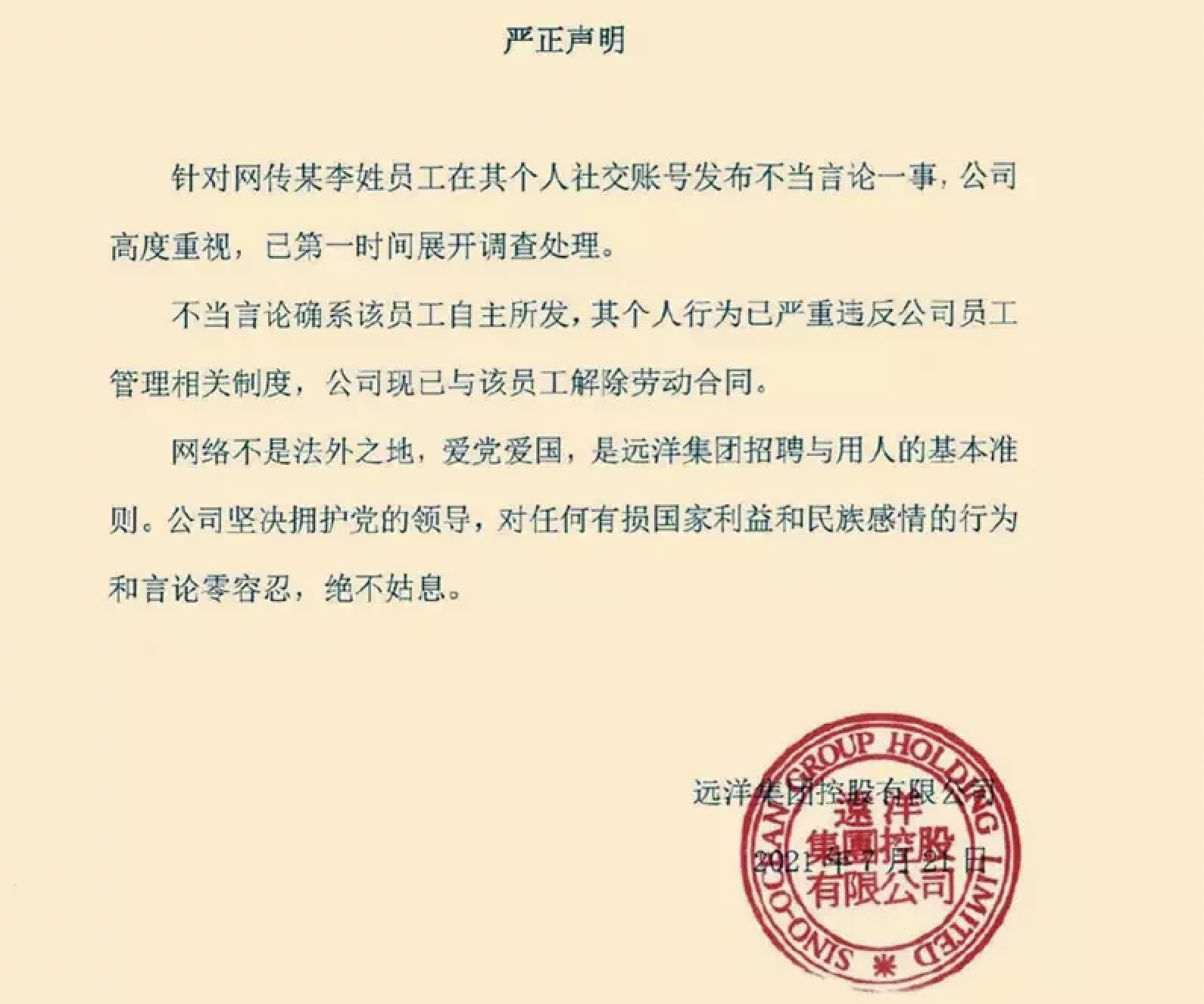 中国远洋集团控股有限公司周三(21日)发布声明称:针对网传李姓员工在其个人社交帐号发布不当言论一事,公司已第一时间处理。不当言论系该员工自主所发,公司已与该员工解除劳动合同。
