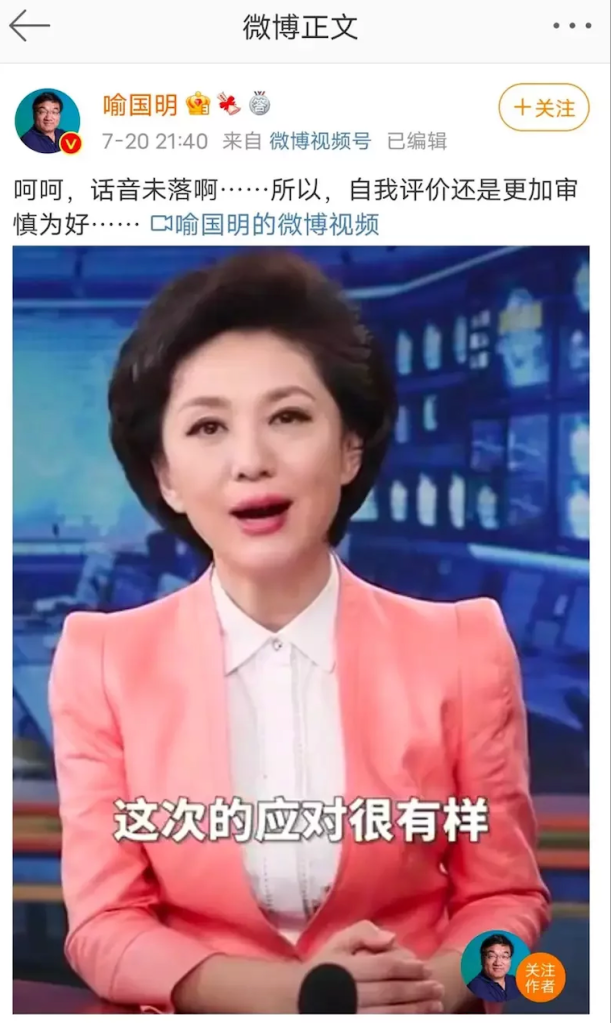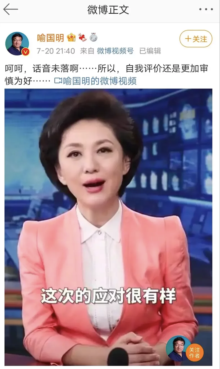 无独有偶,除李睿外,北京师范大学新闻传播学院院长喻国明亦被曝嫁接报导讽河南暴雨。微博显示,周二(20日),喻转发了一条官方媒体对各方应对强降雨措施的肯定,报道称「应对系统相当系统全面」。喻转发该条新闻并配文称「呵呵,话音未落啊……所以,自我评价还是更加审慎为好……」,被认为是在讽刺河南暴雨灾情防控。