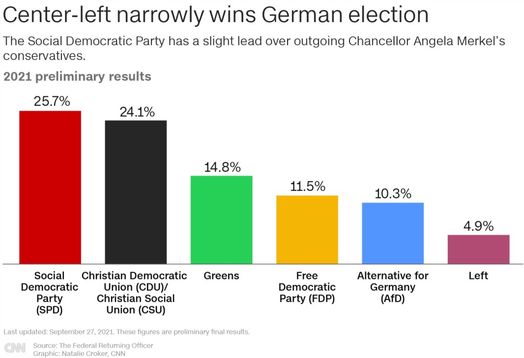 德国现任总理默克尔(Angela Merkel)所在的基民盟/基社盟以历史最低得票率24.1%位居第二,落后社民党1.6个百分点。绿党以14.8%的得票率排名第三,自由民主党以11.5%排名第四,德国选择党以10.3%排名第五。左翼党未突破5%的门槛。