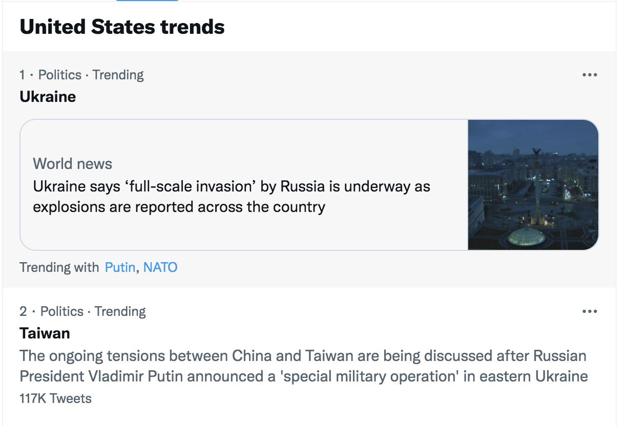 俄乌冲突正式爆发,引发全球各地关注。却有网友发现,明明是乌俄开打,“Taiwan”却成了推特流行趋势关键词,不禁在PTT的Gossiping板上发文,贴出截图表示,“一堆老美认为,下一个开打的国家就是中国台湾”,并问卦“为啥乌俄开打 台湾会上推特热搜第二名?”话题引发议论。