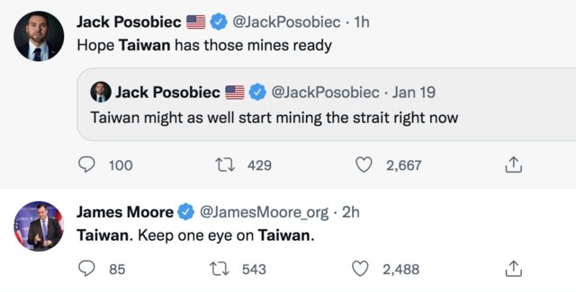 至于第3张截图,是美国的另类右派和另类温和派政治活动家杰克波索比奇(Jack Posobiec),以及前任加拿大创新、科学及工业部长詹姆斯摩尔(James Moore)的发文,两人文中都提到台湾。