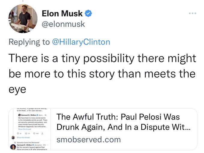 CNN报导称:马斯克在他现在拥有的平台上拥有 1.12 亿粉丝,他发布了关于佩洛西遇袭的内幕故事,以回应希拉里·克林顿 (Hilary Clinton) 在美国东部时间上午 8 点 15 分发布的推文。他后来在下午 2 点左右删除了这条推文,但是在获得超过 28,000 条转发和 100,000 次点赞之后才删除。