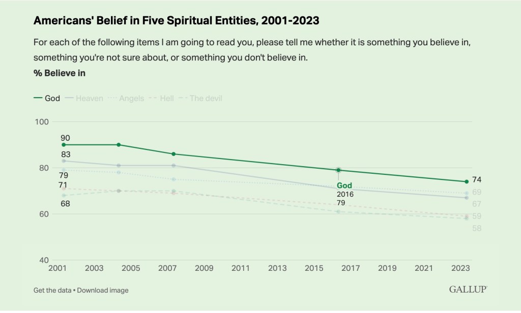 自 2016 年(盖洛普上次就该主题对美国人进行民意调查)以来,对所有五种精神实体的信仰都下降了 3-5 个百分点。