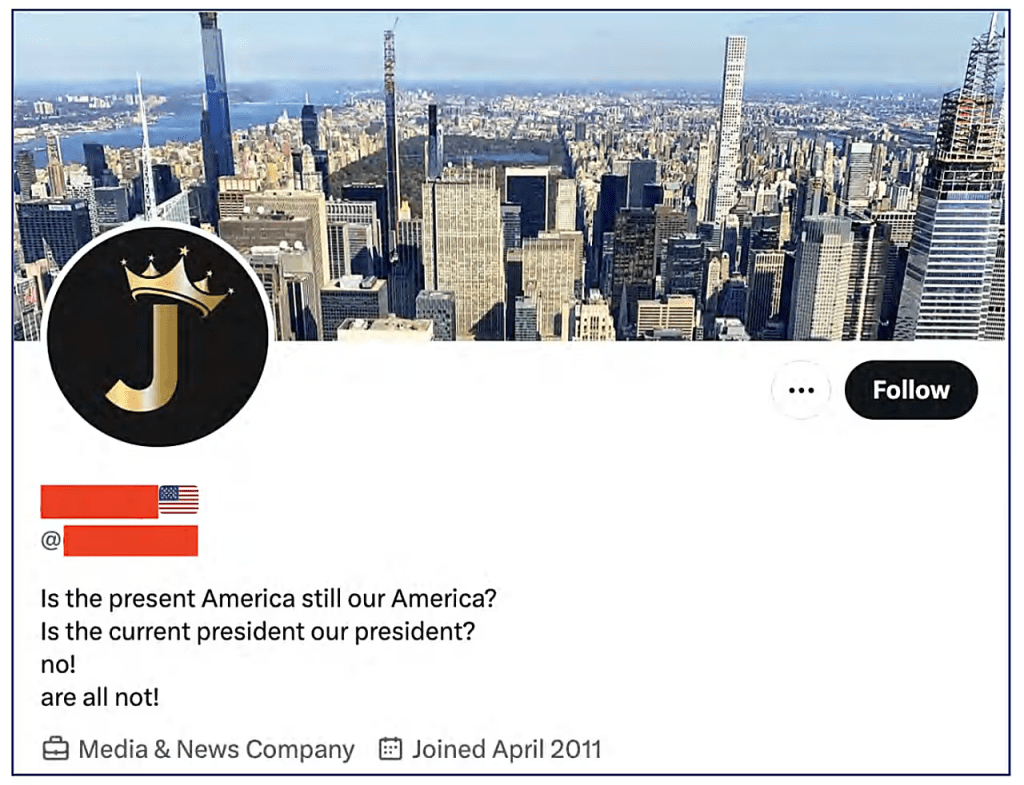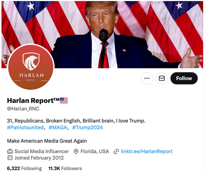 “哈兰报告”在 X 上一直活跃到本周,在《华尔街日报》寻求该公司对该账户发表评论后,X 也暂停了该报告。 X 日,“哈兰报告”似乎冒充 31 岁的保守派人士,吸引了大约 11,000 名追随者。 “31岁,共和党人,蹩脚的英语,聪明的大脑,我爱川普。 #Patriotsunited , #MAGA , #Trump2024 ”。 X 没有回应置评请求。
