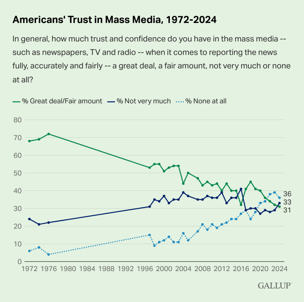 盖洛普公司首次在1972年提出这个问题,并在1997年以来的大多数年份中进行了测量。在1970年代的三次测量中,信任度在68%到72%之间,但在1990年代末和2000年代初的测量中,信任度下降到51%到55%。最新的调查结果来自9月3日至15日进行的民意调查,其中包括盖洛普对美国媒体和其他公民及政治实体信任度的年度更新。