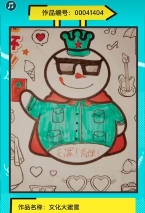 在另一幅名为「文化大蜜雪」的作品中,则是面带微笑的雪人戴着红星王冠、手拿小红书,身上的字句「无罪!有理!」,明显是在指涉文化大革命时期红卫兵的「革命无罪、造反有理」等口号。