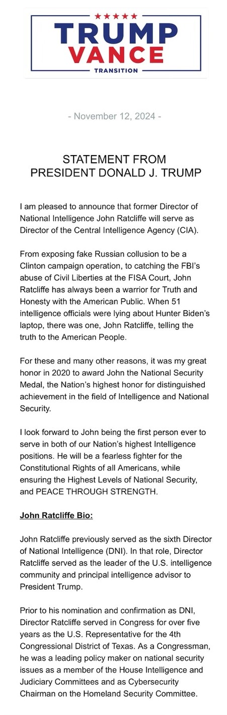 美国当选总统川普在周二宣布,他将任命前国家情报总监约翰·拉特克利夫(John Ratcliffe)担任中央情报局(CIA)局长。