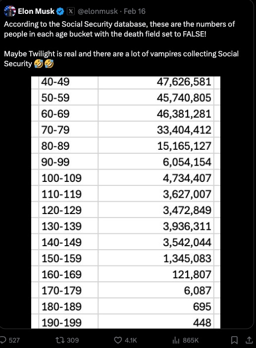 特斯拉和X公司首席执行官、现任政府特别雇员的埃隆·马斯克(Elon Musk)声称,他偶然发现社会保障数据库中列有超过2000万人年龄超过100岁,并称这是“历史上最大的欺诈”。