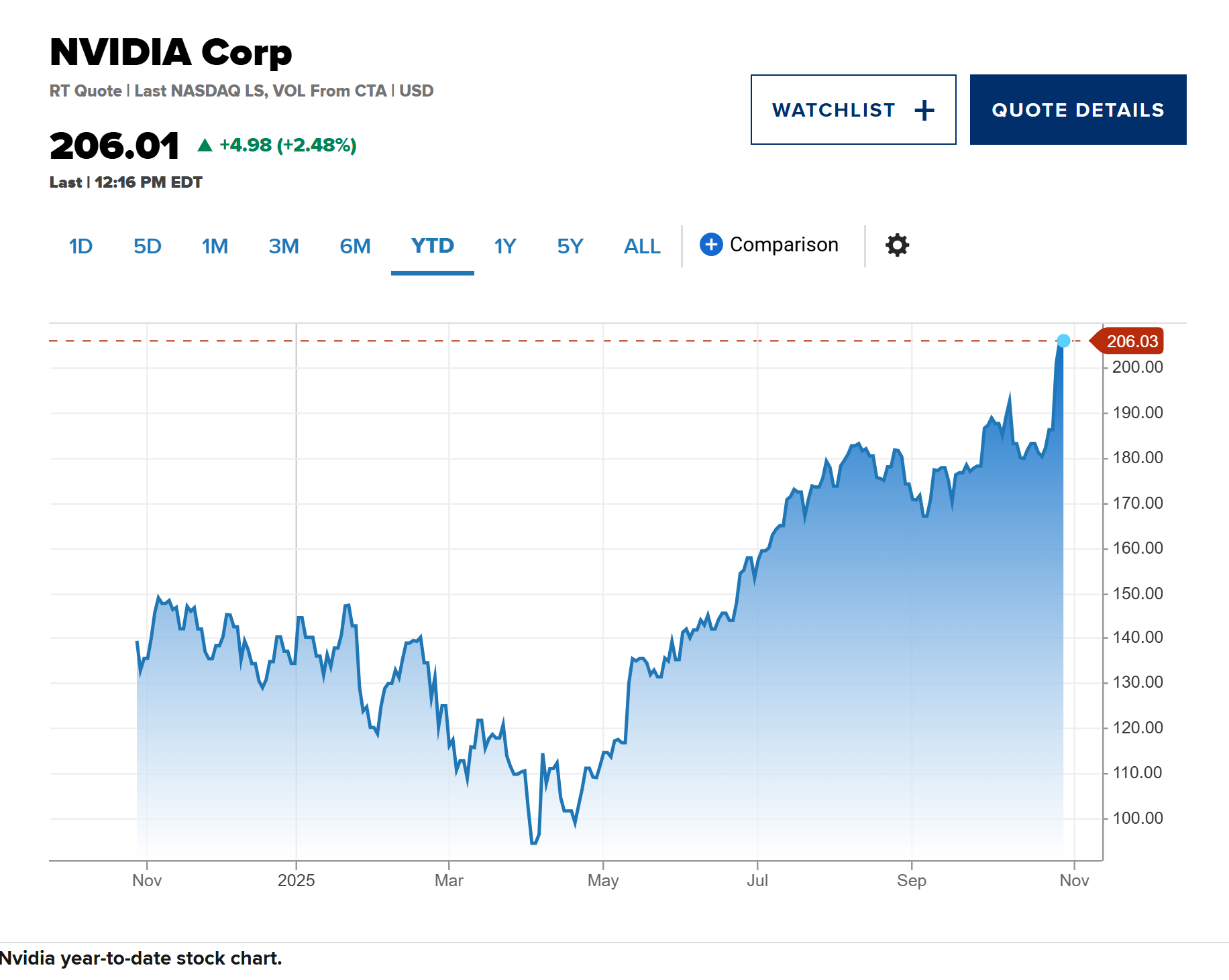 最新一轮上涨紧随该公司首席执行官黄仁勋(Jensen Huang)近期讲话——他表示英伟达预计将获得 5,000亿美元AI芯片订单,并宣布计划为美国政府建造 7台全新超级计算机。
