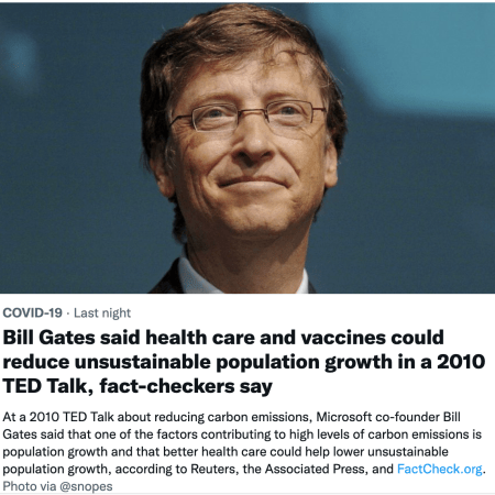 “事实核查”证实阴谋论:比尔·盖茨在2010年的TED演讲中说医疗保健和疫苗可以减少不可持续的人口增长